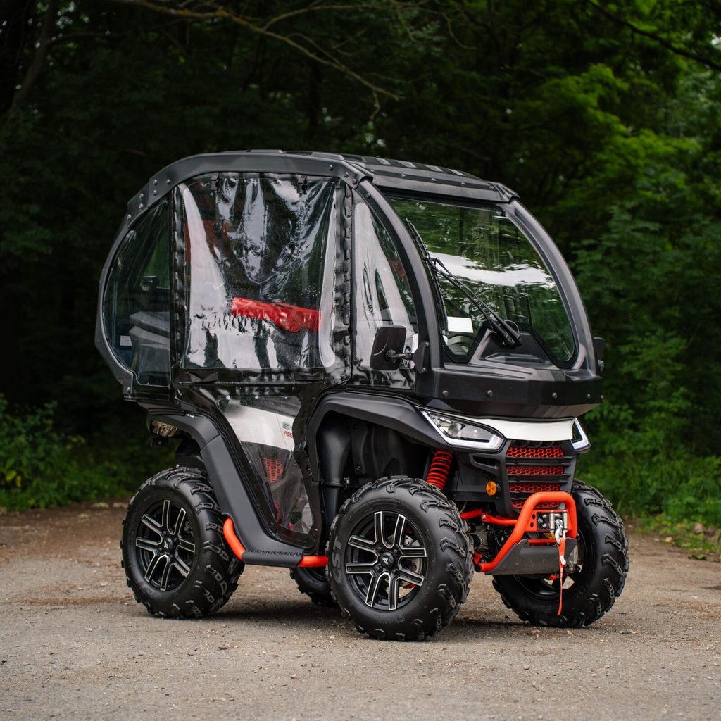 Kompletní kabina pro čtyřkolku Segway Snarler AT6 S, vyhřívané čelní sklo se stěračem a ostřikovačem, na magnety lehce uzavíratelné plachtové dveře. Chrání jezdce před povětrnostními vlivy a znečištěním