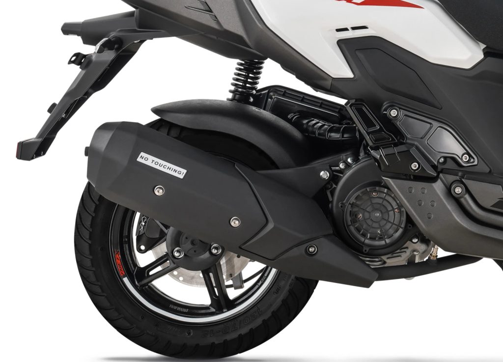 Elegantní matně černý výfuk má integrovaný tepelný štít a doplňuje tak čistý design skútru.