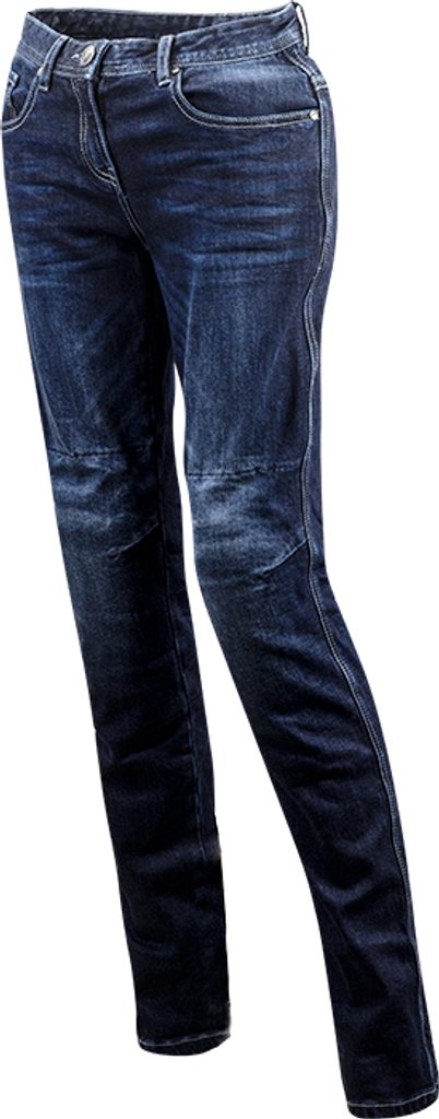 Dámské džíny na motorku s vyjímatelnými chrániči kolen, strečová konstrukce, rovný střih, lehce zúžené nohavice, Kevlarová výztuha na exponovaných místech kolen a zadní části, výborná prodyšnost, bezpečnostní švy, zesílení aramidovým vláknem, kapsy pro chrániče kyčlí, CE-certifikace
