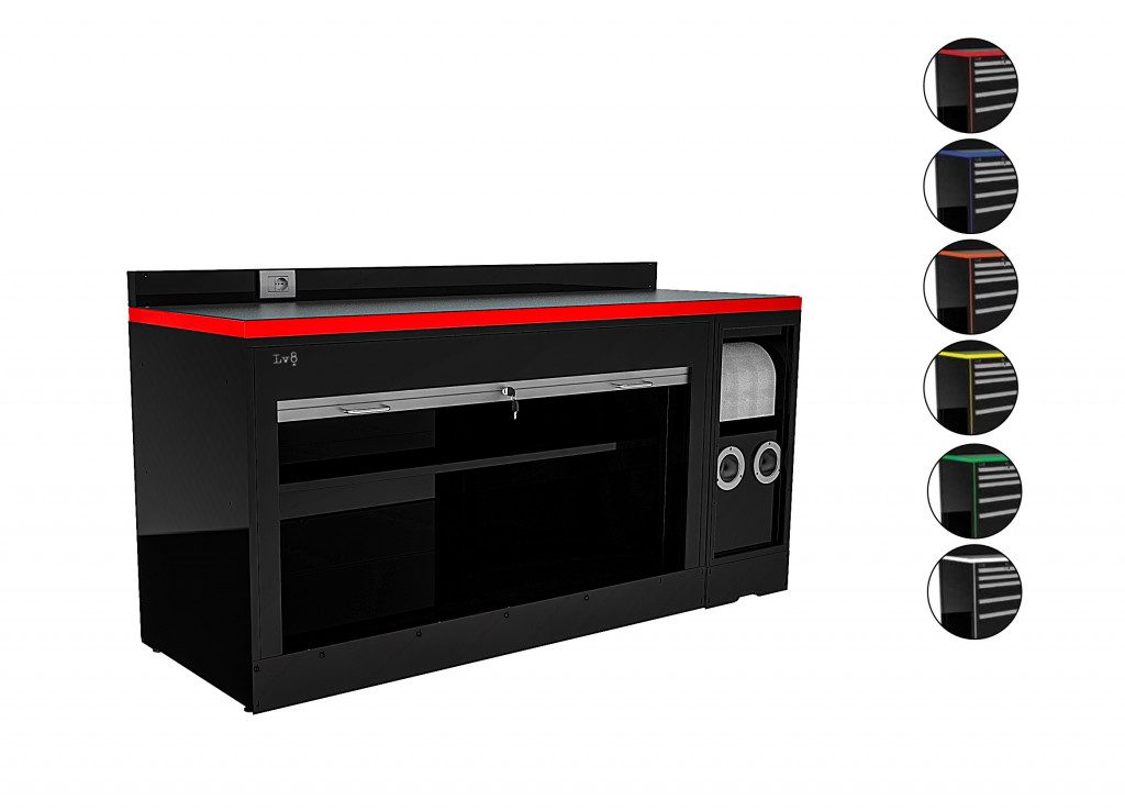 L 2000mm Workbench with L 1600mm. Cabinet with roller shutter, key lock and inside shelf, L 400mm Cabinet with predisposition for 2 hose reels and paper holder compartment, H 100mm. Bottom closing panel with electric socket, Worktop and Anti-Petrol and Anti-Oil ABS Worktop cover.