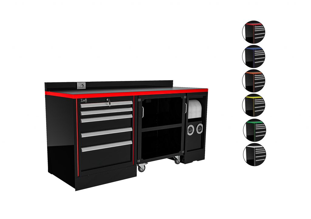 L 2000mm Workbench with L 800mm. Cabinet with 5 drawers, L 800mm. Under table trolley 3 shelves, L 400mm Cabinet with predisposition for 2 hose reels and paper holder compartment, H 100mm. Bottom closing panel with electric socket, Worktop and Anti-Petrol and Anti-Oil ABS Worktop cover.