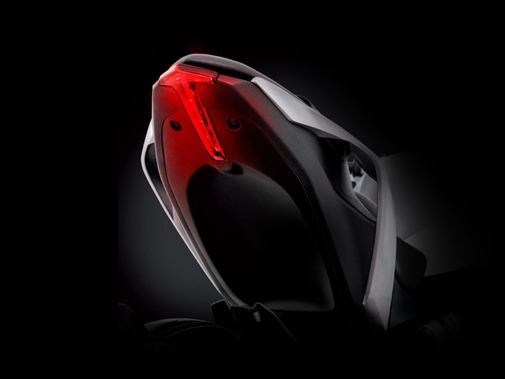 Zadní část SRK 400 zaujme jak líbivými liniemi a minimalistickým desigem, tak i tělem LED osvětlení ve tvaru „T“, které mu dodává osobitý vzhled. Dalším dynamickým prvkem jsou spoilery na obou stranách sedadla spolujezdce, které propůjčují tomuto dvouválcovému streetfighteru sportovní charakter.