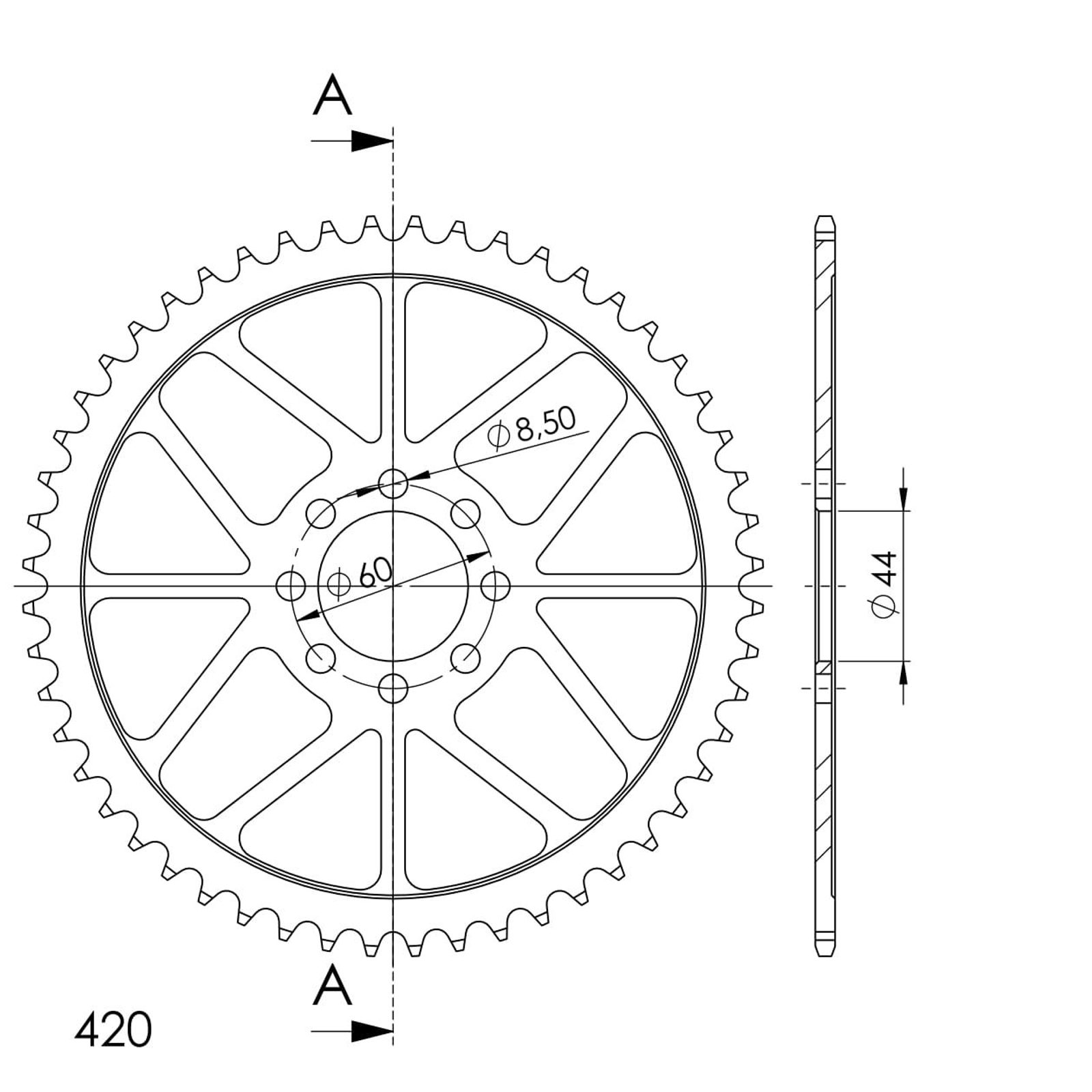 Pevnější zuby = vyšší životnost řetězové sady až o 10%. Rozeta 52z, řetěz 420.