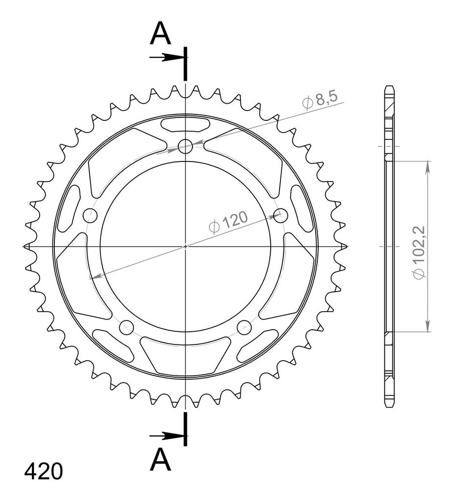 Pevnější zuby = vyšší životnost řetězové sady až o 10%. Rozeta 46z, řetěz 420.