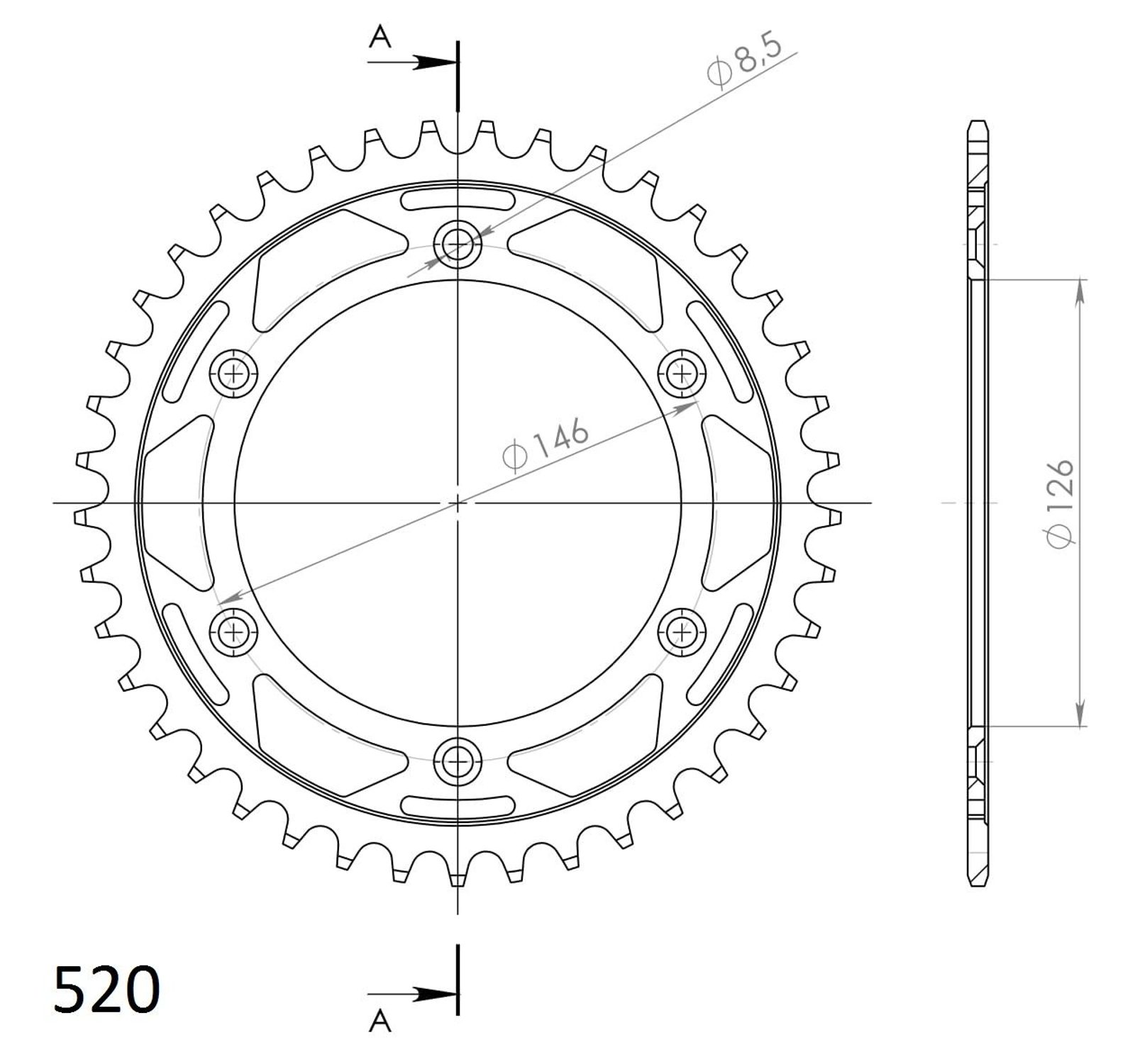 Pevnější zuby = vyšší životnost řetězové sady až o 10%. Rozeta 41z, řetěz 520.