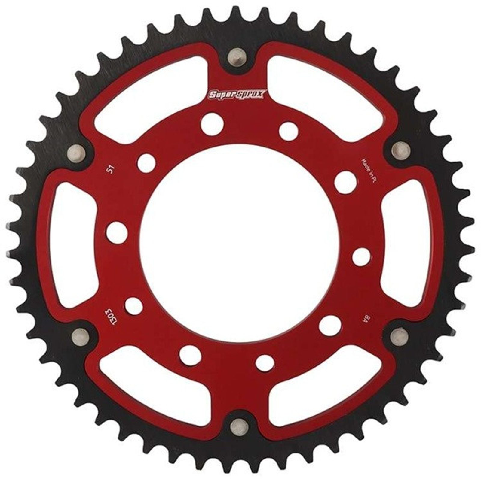 Řetězová rozeta SUPERSPROX STEALTH RST-1303:51-RED červená 51 zubů, 520 Patentované řešení pro dlouhou životnost/nízkou hmotnost s nejpevnějším snýtováním na trhu. 3x delší životnost než nejkvalitnější hliníkové rozety.