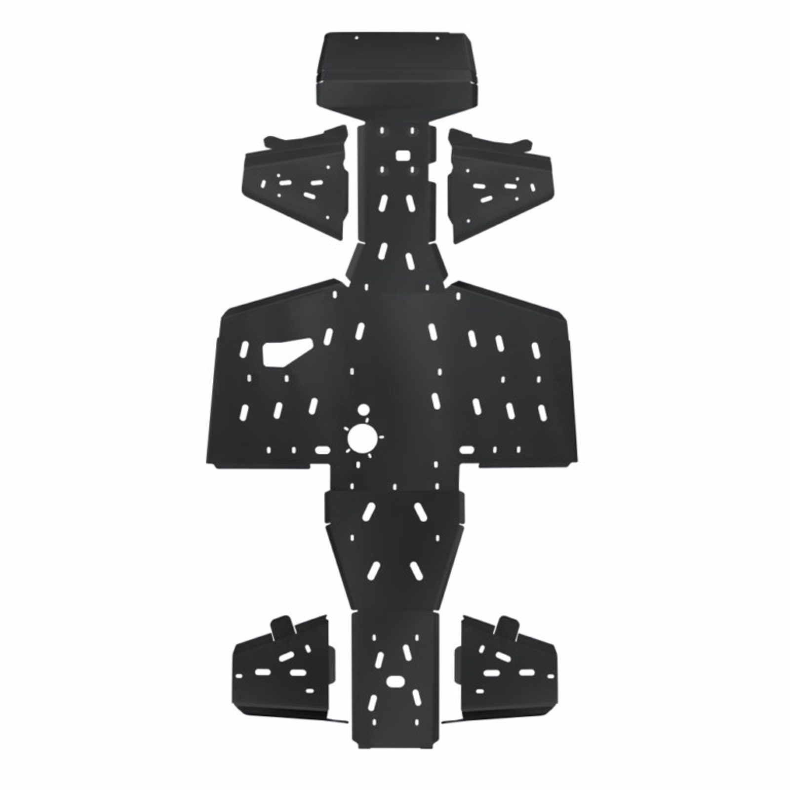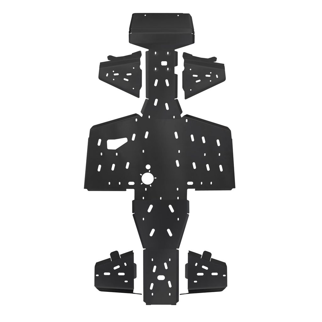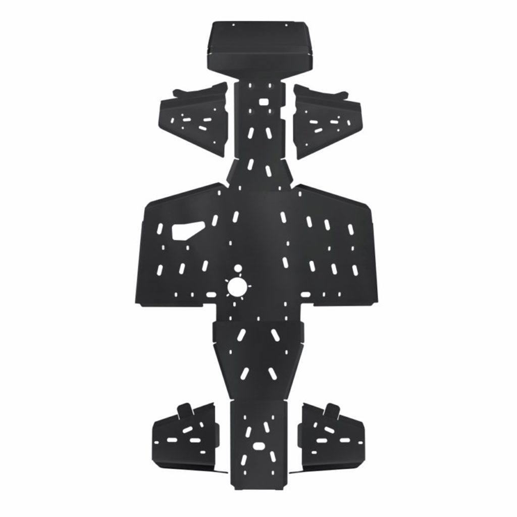 Kompletní PHD kryty podvozku Shark, odolná ochrana spodní části stroje, z vysokopevnostního polyetylenu tloušťky 10 mm, montážní otvory pro snadnou údržbu, výřezy pro snadný odtok vody a bláta, včetně integrovaných krytů nášlapů, nízká hmotnost, snadná montáž