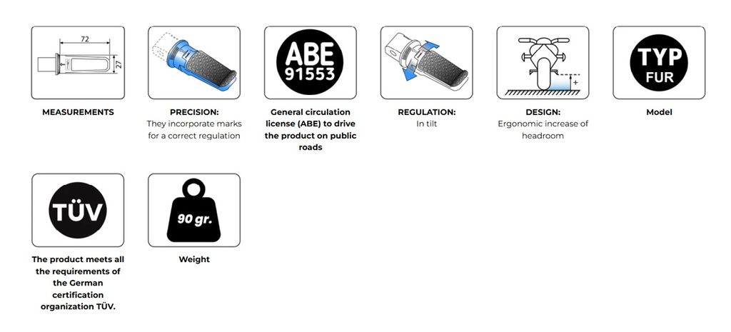 | UPOZORNĚNÍ: | Nutno dokoupit adaptéry stupaček dle vybraného motocyklu. |