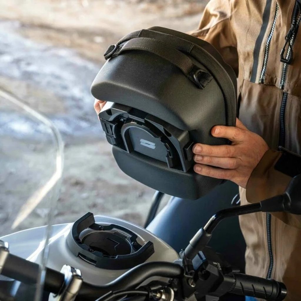 Click System je jedinečná metoda upevnění, která nahrazuje několik šroubů kolem víčka palivové nádrže držákem ve tvaru podkovy. Brašnu na nádrž pak lze zacvaknout na místo a uvolnit jediným tlačítkem.